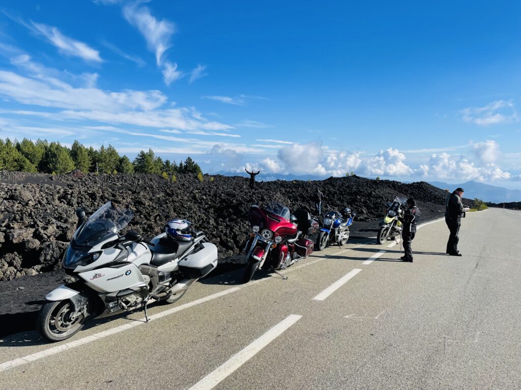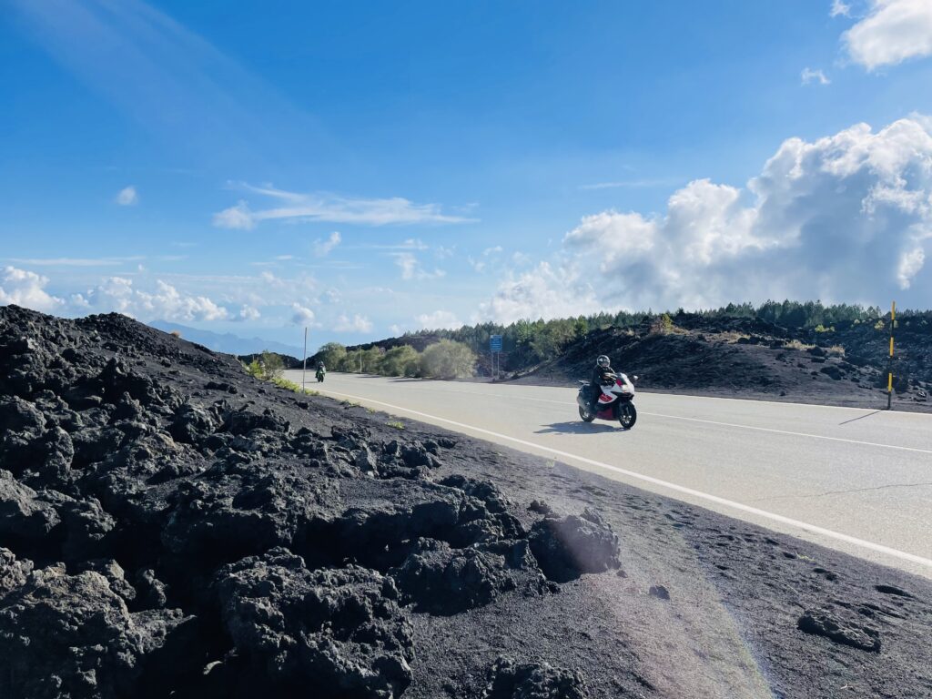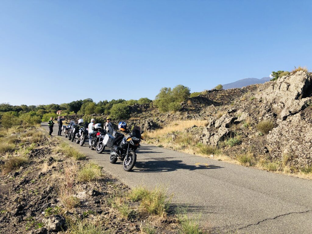 Unser Tagesziel ist die Region rund um den mondänen Küstenort Taormina. Über kleine und verlassene Bergstrassen und -dörfer durchqueren wir die Insel auf dem Weg zur Ostküste. Schon bald rückt der Ätna in unseren Fokus. Der Vulkan dominiert das Landschaftsbild schon von weitem. Wir motorradwandern an seinem Fuss entlang, erfreuen uns an faszinierenden Ausblicken und dem typischen Gestein. In Giardini Naxos bleiben wir zwei Nächte.