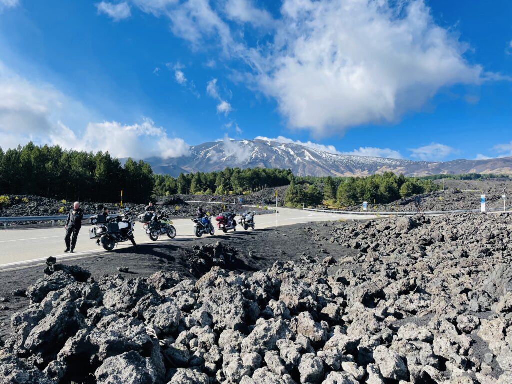 Unser Tagesziel ist die Region rund um den mondänen Küstenort Taormina. Über kleine und verlassene Bergstrassen und -dörfer durchqueren wir die Insel auf dem Weg zur Ostküste. Schon bald rückt der Ätna in unseren Fokus. Der Vulkan dominiert das Landschaftsbild schon von weitem. Wir motorradwandern an seinem Fuss entlang, erfreuen uns an faszinierenden Ausblicken und dem typischen Gestein. In Giardini Naxos bleiben wir zwei Nächte.